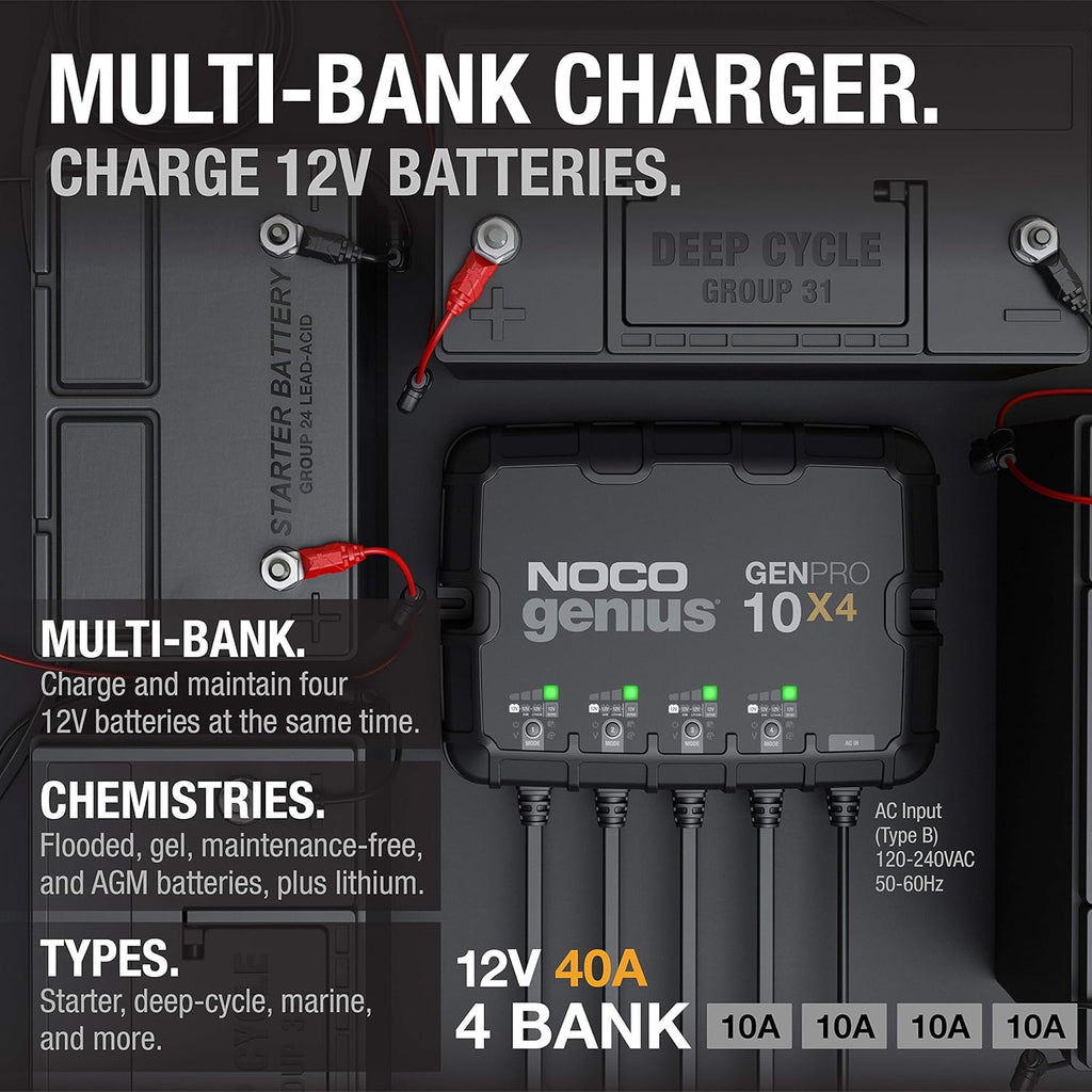 MULTIPLE BANKS — A four-bank onboard battery charger rated at 40 amps total - 10 amps per bank. Independently charge 12V batteries in marine, boat, starter, and deep-cycle systems.